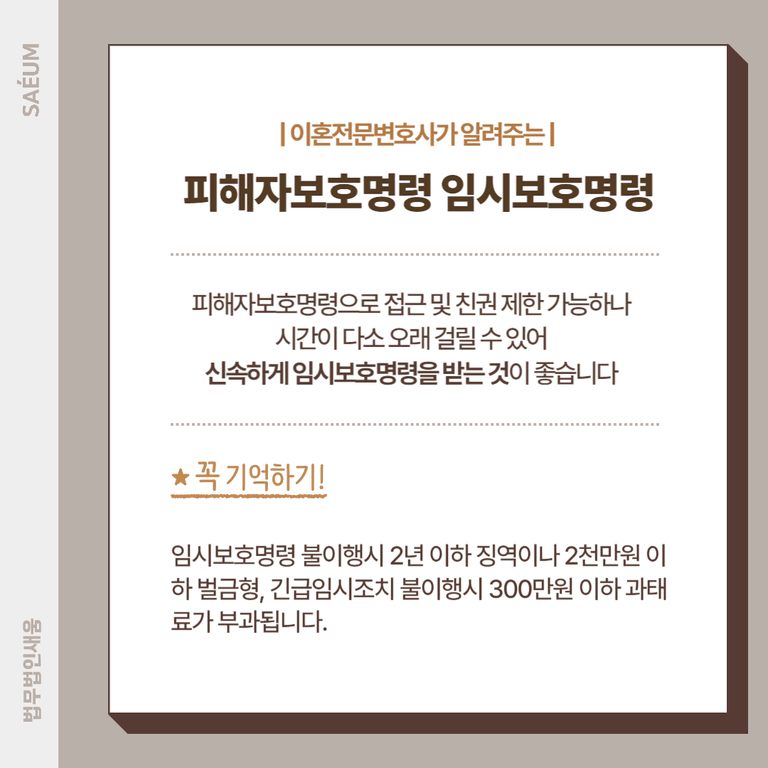 법무법인 새움에서는 B씨가 A씨의 거처를 알고 있는 상황이며, 언제든 다시 찾아와 폭력을 행사할 수 있는 상황이기 때문에 이와 같은 상황을 강조하여 피해자보호명령 청구를 진행하였고, 상황의 심각성을 강조한 결과 바로 당일에 B씨의 접근과 연락을 금지하는 임시보호명령 결정을 받아 A씨의 안전을 확보해 볼 수 있었습니다.