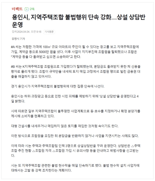 지역주택조합 사업이 제도의 폐지가 언급될 정도로 곳곳에서 부작용과 피해사례가 속출하자 각 지자체별로 지역주택조합 사업에 대한 실태조사와 피해예방을 위한 주의사항 안내를 대대적으로 진행하고 용인시에서는 피해자들을 위한 상설 상담반을 운영한다는 소식을 전하는 등 하루가 멀다하고 지역주택조합에 관한 뉴스들이 연일 쏟아져 나오고 있습니다.