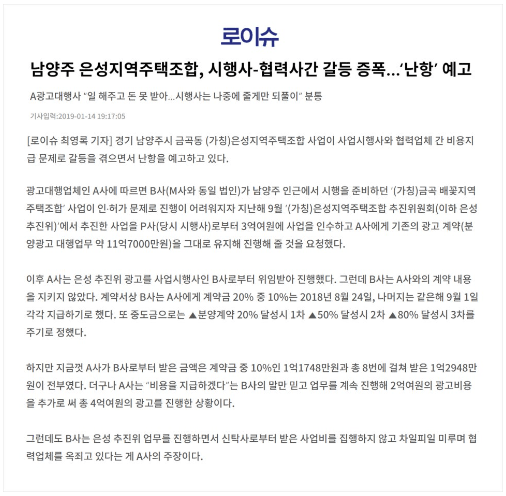 은성 지역주택조합은 남양주시 금곡동 700-56번지 일대에서 아파트를 건립하기 위해 만들어진 조합으로 무려 2014년경부터 조합설립을 추진하며 조합원들을 모집하였습니다. 그러나 조합측에서 사업이 순조롭게 진행될 것이라고 안내했던것과 달리 추진위원회 임원진들의 각종 비리와 시행사 및 협력업체 간 비용지급 문제가 불거지는 등 다양한 문제점들을 노출하며 장기간 사업이 지체되고 있어 많은 조합원들께서 조합탈퇴를 위한 상담문의를 주시고 계십니다.