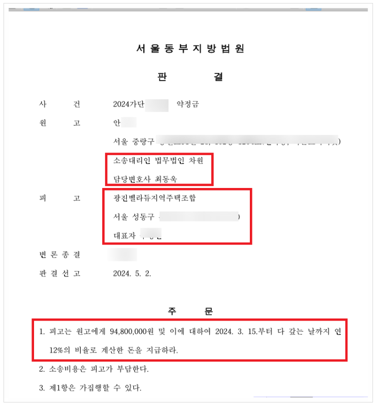 지난주인 2024. 5. 2. 최동욱 변호사가 광진벨라듀 지역주택조합을 상대로 9,480만원 전액 승소판결을 이끌어 냈기에,