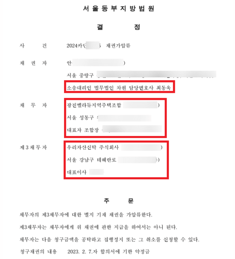 아울러, 최동욱 변호사는 의뢰인의 실제 피해금액 회수를 위하여, 광진벨라듀 지역주택조합의 자금관리대리사무를 담당하는 신탁회사(우리자산신탁)를 상대로 채권압류추심 등 강제집행을 진행 중에 있습니다.
