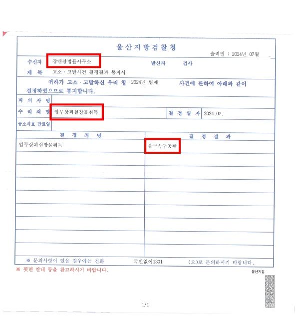 이에 울산지방검찰청에서는 피의자를 업무상과실장물취득으로 불구속구공판 하였습니다.