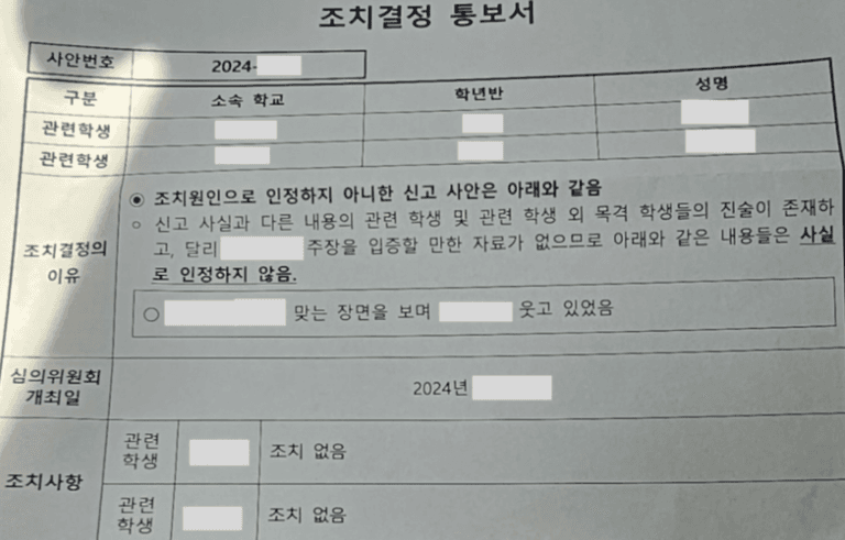 의뢰인은 불처분 결정을 받았습니다. 혐의 없다는 것을 인정받은 것입니다. 비록 조사를 받고 학교폭력대책위원회에 출석하는 과정상의 어려움을 겪기는 했으나 그 어떠한 불이익 처분도 받지 않았습니다.