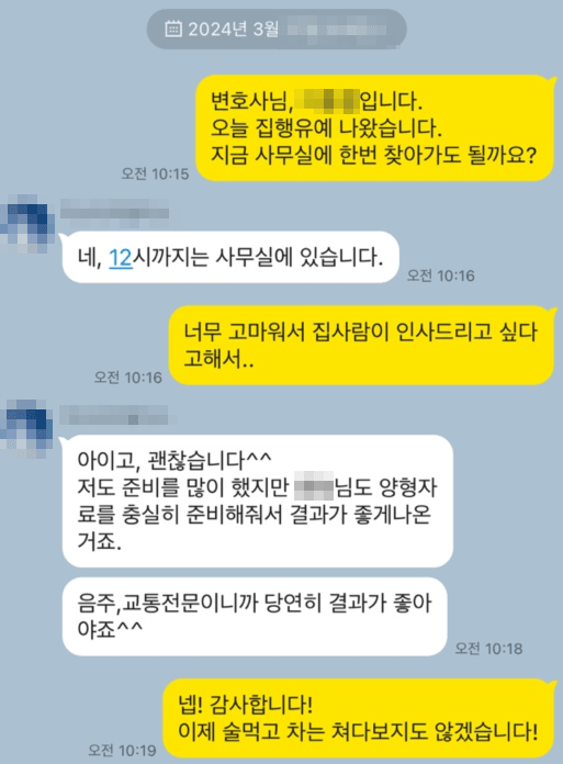 그래서 음주사건을 많이해본 변호사들은 끝까지 의뢰인과 소통하며 의견서와 양형자료 준비에 최선을 다합니다.