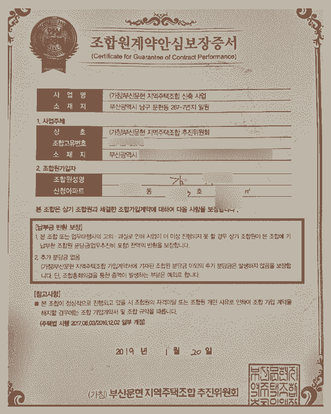 의뢰인(김00)은 부산 남구 문현동 267-7 번지 일대에서 아파트건설을 추진하는 부산문현지역주택조합과 사이에 조합가입계약을 체결하고, 합계 5730만원의 조합원분담금 및 업무대행비를 납부했습니다.