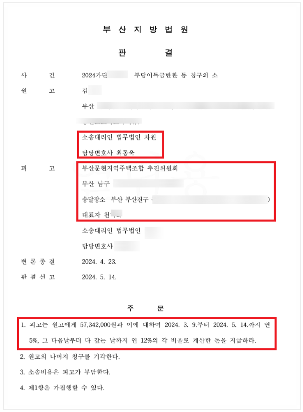 [ 부산문현지역주택조합을 상대로 한 전액 승소 판결 ]