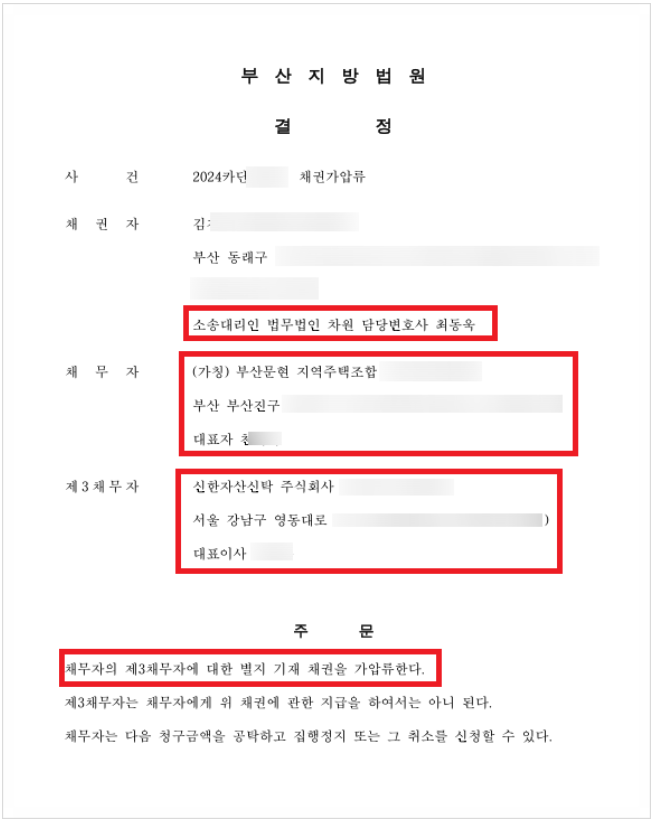 아울러, 최동욱 변호사는 의뢰인(김00)의 실제 피해금원 회수를 위하여, 부산문현지역주택조합의 자금관리대리사무를 맡고 있는