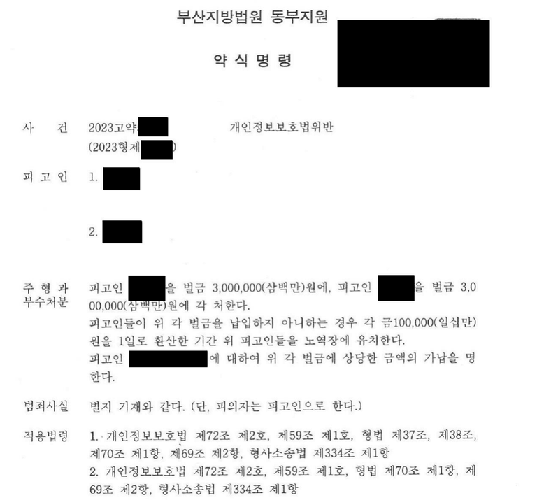 개인정보보호법위반으로 약식명령이 나옵니다.