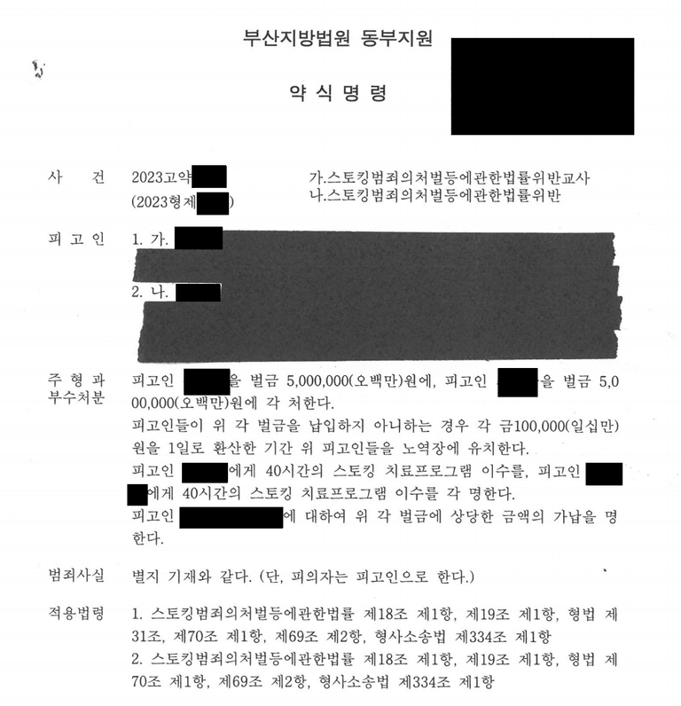 스토킹처벌법위반도 약식명령이 나옵니다.