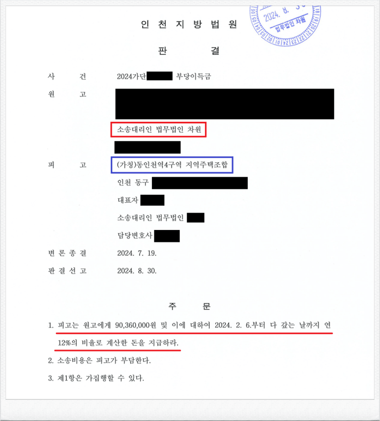 그러나, 가입 후 피고 (가칭)동인천역4구역 지역주택조합 측의 사업이 계획대로 진행되지 않았고, 이에 의뢰인은 정식 민사소송을 통하여 기 납입한 금원의 반환을 원하셨습니다.