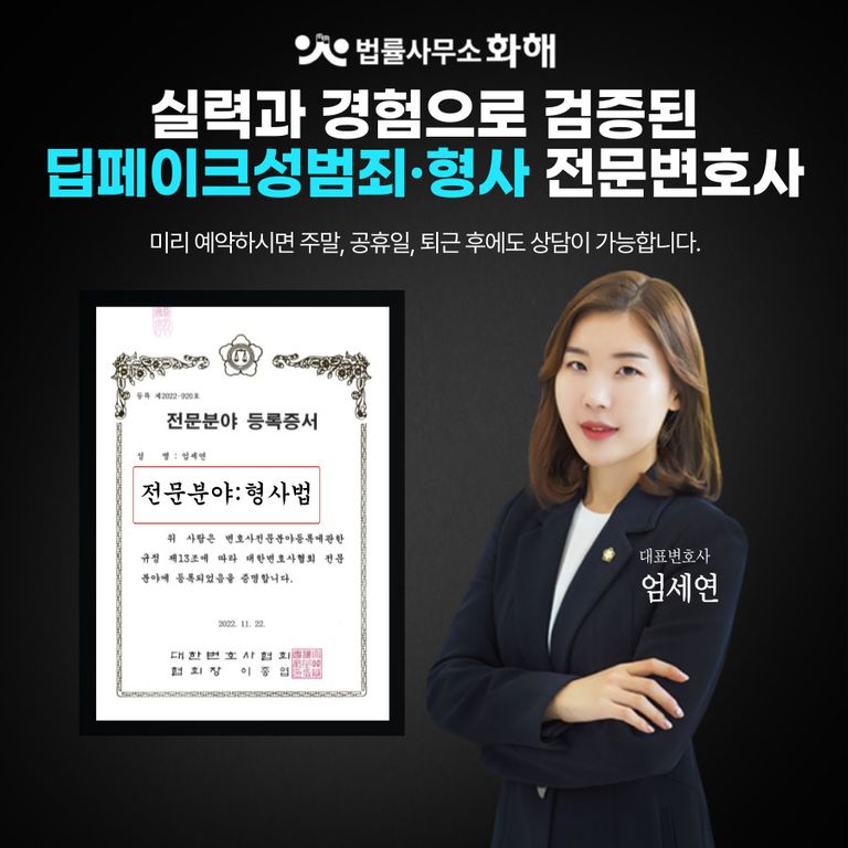 특히 딥페이크 성범죄는 익명성이 보장되는 공간에서 활동하고 제작과 유포 과정 역시 복잡하게 이루어지기 때문에 피해자가 혼자 이를 추적하고 법적 대응을 하고 해결하기란 어려울 것입니다. 법적 제도 역시 이러한 신종 범죄에 대응하기에 부족한 점이 많아 피해자들이 보호받기 어려울 것이기에, 다양한 디지털 범죄를 다룬 경험을 바탕으로 피해자가 적절한 법적 절차를 통해 피해를 회복할 수 있도록, 신속하고 효과적으로 문제를 해결할 수 있도록, 법률사무소 화해가 도와드리겠습니다. 딥페이크 성범죄는 누구나 당할 수 있습니다. 최근에는 연예인까지 피해 입어 고통을 호소하고 있는 상황인데요. 이러한 딥페이크 성범죄 피해를 입었다면 주저하지 말고 법률사무소 화해 디지털 성범죄·딥페이크·형사 전문 변호사와 상담하여 피해를 최소화하고 의뢰인의 권리를 지키시길 바랍니다.