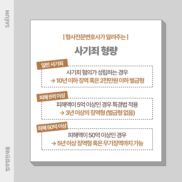 혐의 성립이 되기 위해서는 고의로 타인을 기망해야 하며, 이와 같은 행위를 통해 재물을 받아 본인 혹은 제3자가 이익을 취하게끔 해야 합니다. 만일 혐의가 성립되는 경우 이득액에 따라서 그 처벌이 달라지는데요. 일반적으로는 10년 이하 징역 혹은 2천만 원 이하 벌금형에 처하게 됩니다. 하지만 5억 이상인 경우 일반적인 사기가 아니라 특경법의 적용을 받게 됨에 따라 3년 이상의 징역형에 처하게 되므로 주의가 필요합니다. 또한 50억 이상이라면 5년 이상의 징역 혹은 무기징역까지도 내려올 수 있습니다.