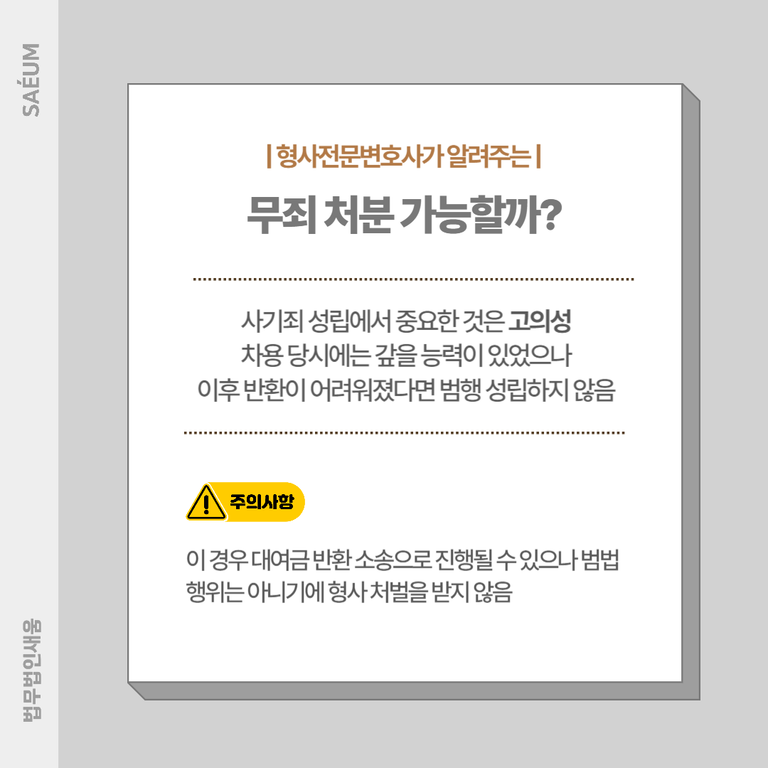 해당 범행의 성립에서 중요한 것은 고의성입니다. 따라서 처음 약속한 바와 달리 대여금을 제대로 갚지 못하는 상황이라고 하여도, 차용을 할 당시 충분히 갚을 수 있는 능력이 있었으며 이후에 문제가 생겨날 것을 예상하지 못해 부득이하게 제대로 반환하지 못했다면 범행이 성립되지 않습니다. 이 경우 대여금 반환 소송으로 민사소송이 진행될 수는 있으나 범법행위를 한 것은 아니기 때문에 형사적인 처벌을 받지는 않습니다. 따라서 고의성이 없음을 명확하게 밝히는 등의 적극적인 대응을 통해 무죄를 입증할 수 있도록 해야 합니다.