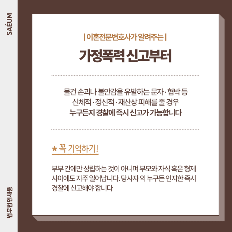 기본적으로 가정폭력은 직접적으로 때리는 경우만을 의미하지 않습니다. 물건을 던져서 손괴하였거나, 공포심 혹은 불안감을 유발할 만한 문자와 영상을 지속해서 전송하였거나, 협박을 가한 경우에도 모두 해당합니다. 일련의 행위를 통해 신체적, 정신적, 혹은 재산상의 피해를 준 사실이 존재하면 곧바로 경찰에 신고하여야 합니다. 또한 부부간에만 성립하는 것이 아니며, 부모와 자식, 혹은 형제 사이에도 자주 일어납니다. 이때 당사자가 반드시 신고해야 하는 것이 아니며, 누구든 인지한 즉시 신고가 가능합니다. 구체적으로 당시의 상황을 설명하고, 이를 뒷받침하는 근거자료를 제시하여 가해자가 잘못에 상응하는 대가를 치를 수 있도록 변호사에게 도움을 요청하시기를 바랍니다.