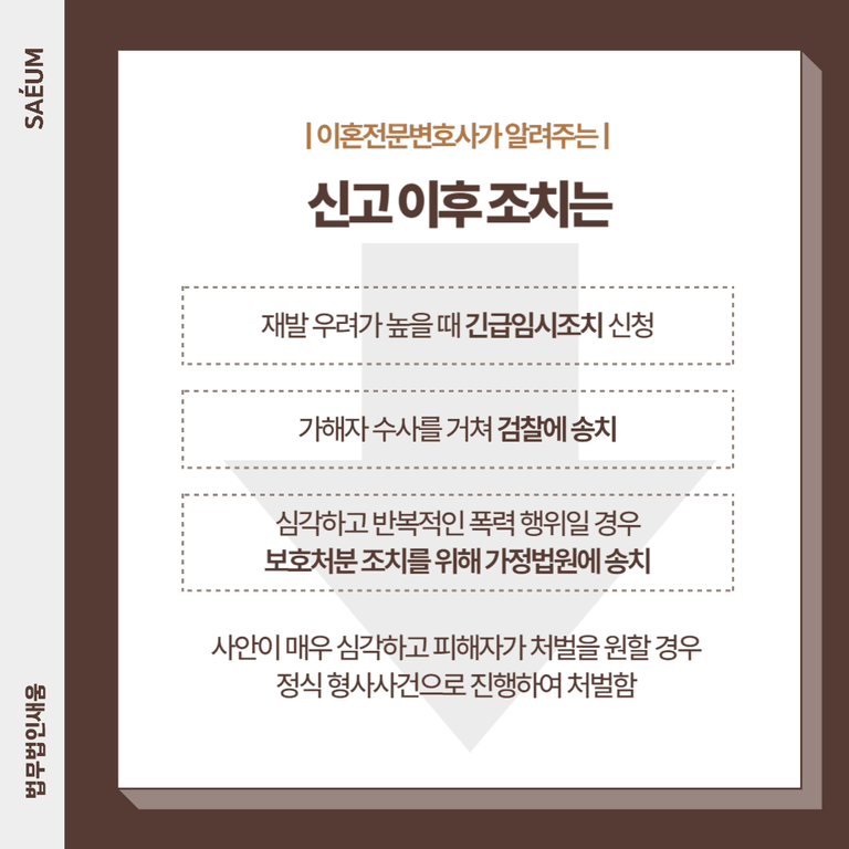 심각한 수위의 폭력을 당하여 가정보호절차에 따라 처분을 받도록 해야 한다면, 늦기 전에 전문변호사와 상담하여 신고부터 재판까지 철저한 준비에 들어가시기를 바랍니다.
