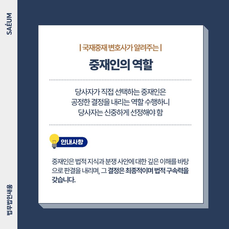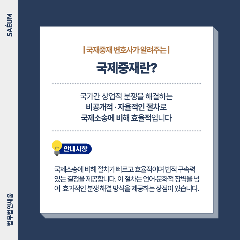 이러한 문제를 보다 효율적이고 신속하게 해결할 방법이 국제중재입니다. 국제중재 절차는 전통적인 법정 소송보다 절차 기간이 짧으면서도, 판결문과 동일한 효력을 가지는 결정이 내려지는 장점이 있습니다. 하지만 성공적인 중재 결과를 도출하기 위해서는 철저한 준비가 필수입니다. 사건에 대한 분석과 객관적 근거자료를 바탕으로 중재 절차를 진행해야 하며, 이 과정에서 국제중재 경험이 풍부한 변호사의 조력이 매우 중요합니다.