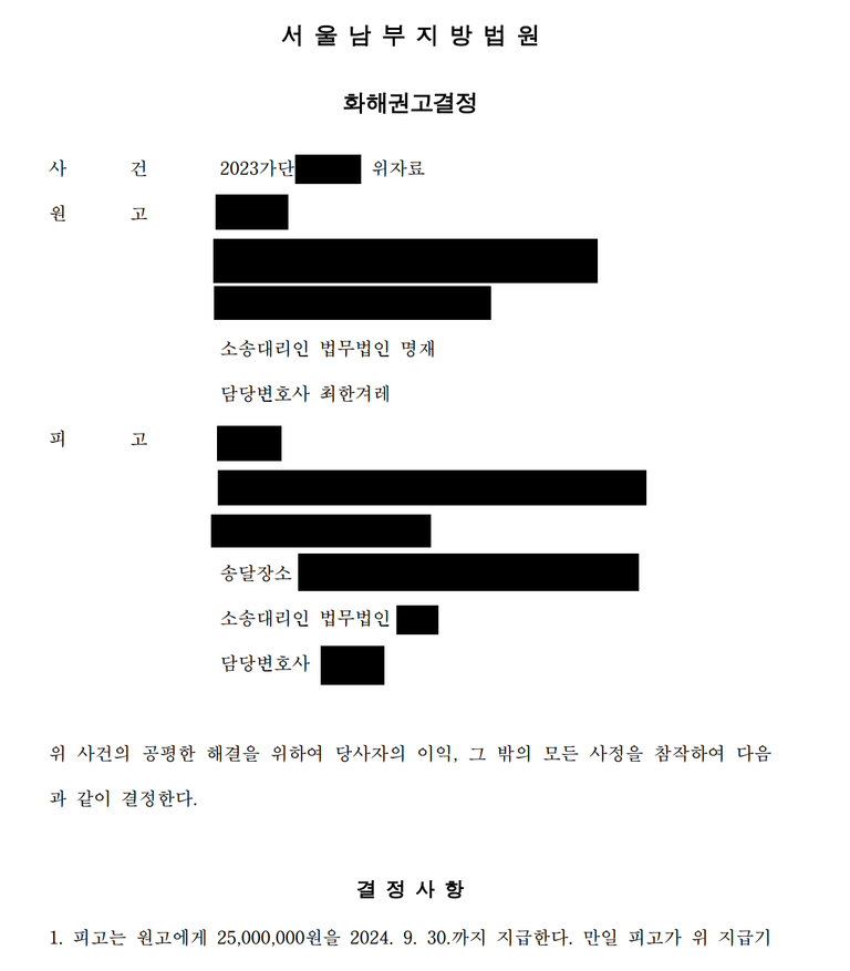 3. 결과피고는 기한내로 위자료 2,500만 원을 원고에게 지급하라는 화해권고결정이 나왔고 양측은 받아들이면서 확정됩니다.