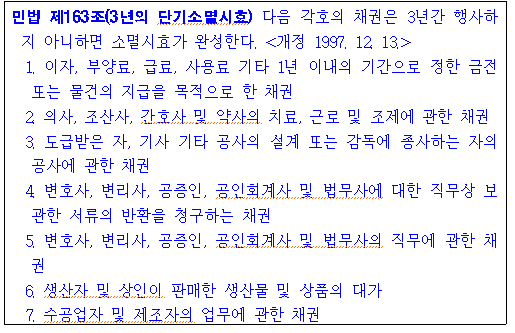 그 밖에 3년이 지나면 소멸시효가 완성되는 것으로 변호사에 대한 수임료가 있습니다.
