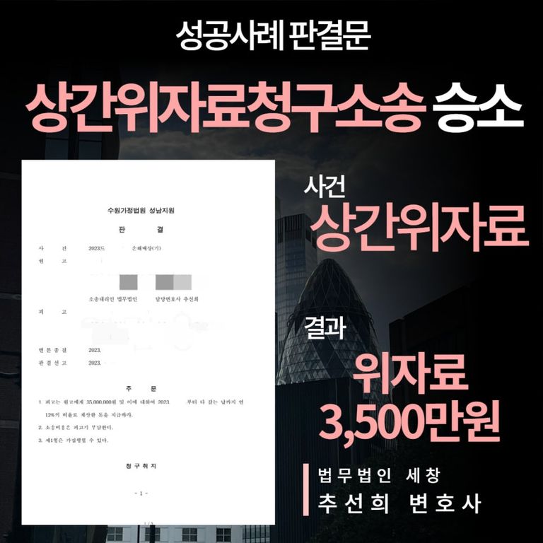 이러한 본 변호인의 조력으로 인해 위자료청구소송에서 승소하여 3,500만원의 위자료를 이끌어낼 수 있었습니다.