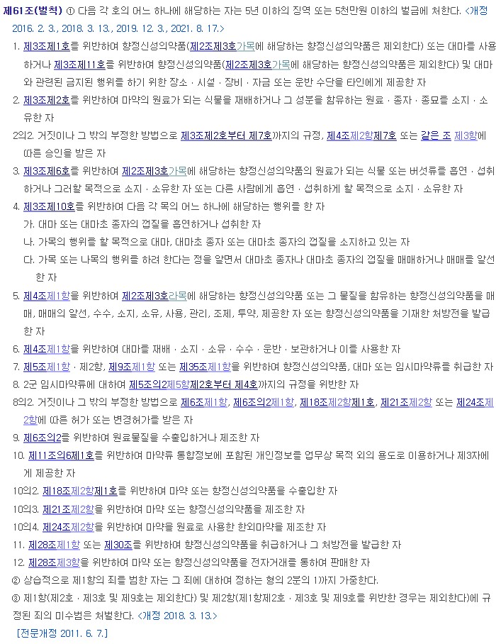 ‘마약류 관리에 관한 법률’(마약류관리법)은 마약류를 '마약', '향정신성의약품', '대마'로 분류하고 있으며, 마약의 종류와 행위 태양에 따라 처벌 수위를 달리 규정하고 있습니다.