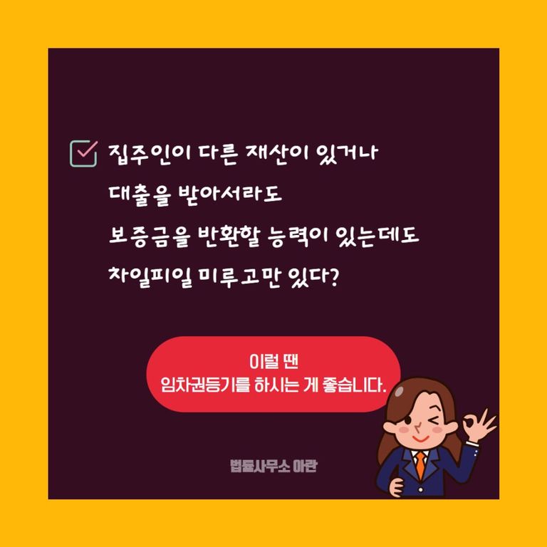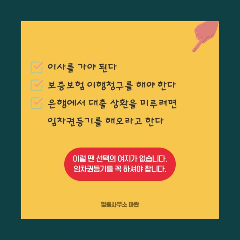 상황이 어떠하든 간에, 세입자가 이사를 가야 하는 경우라면 세입자는 선택의 여지 없이 무조건 임차권등기를 하여야 합니다.