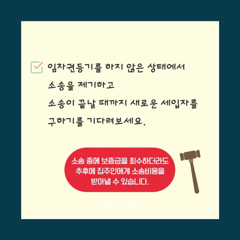 집주인에게 보증금반환청구 소송을 걸어서 전세금을 반환받을 수 있는 권리는 미리 확보하면서, 소송 기간 동안에라도 집주인이 새로운 세입자를 구할 수 있도록 임차권등기는 하지 않고 기다려보는 것이지요.