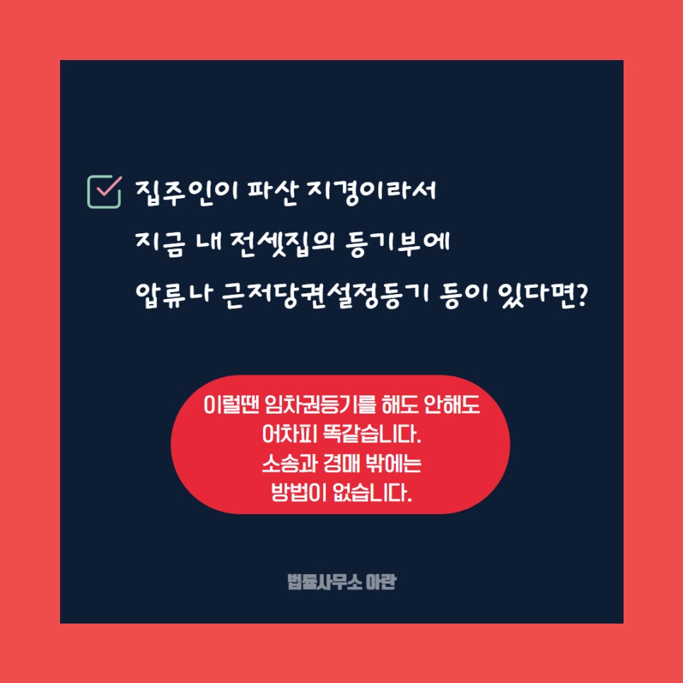 이렇듯 집주인이 파산으로 나아가는 지경이라면, 지금 세입자가 임차권등기를 하는 것은 큰 의미가 없습니다.