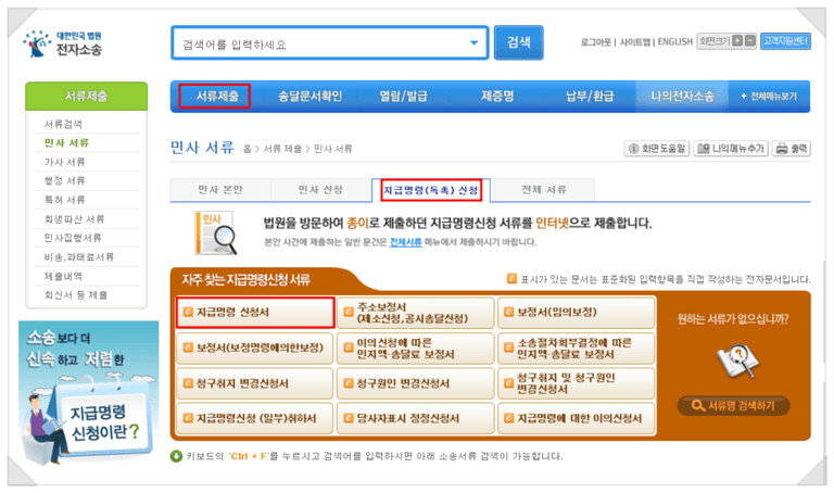 인터넷으로 지급명령을 신청하실 때에는 전자소송 시스템을 이용해야 하므로 별도의 양식이 필요하지 않습니다.
