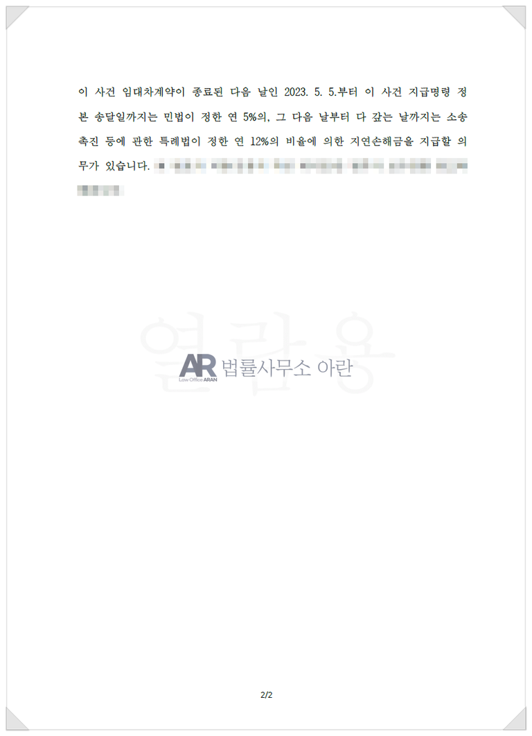 위 1항의 금액에 대하여 2024. 5. 5.부터 이 사건 지급명령 정본 송달일까지는 연 5%, 그 다음 날부터 다 갚는 날까지는 연 12%의 각 비율로 계산한 돈 ※ 집주인에게 집을 인도한 다음 날(이사를 마치고, 비밀번호를 넘겨주고, 집을 완전히 비운 날)을 기재합니다.