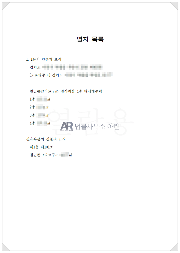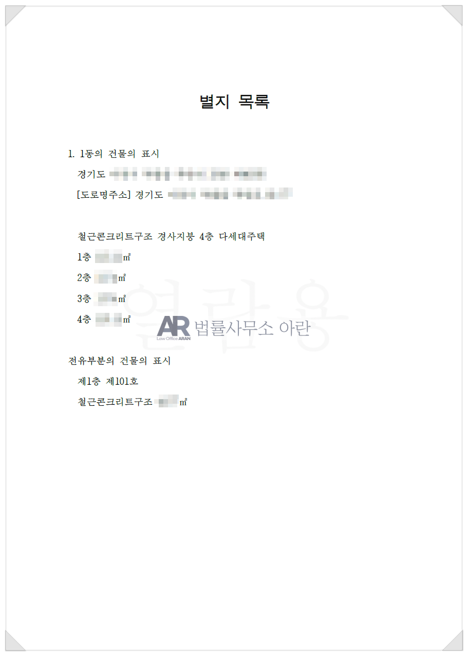 그리고 이때 내가 인도할 예정인 건물, 즉 나의 전셋집의 등기부를 참고로 별지 목록을 작성하여 첨부서류로 제출하여야 합니다. 예를 들면 아래와 같은 방식으로 작성하시면 됩니다.