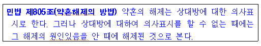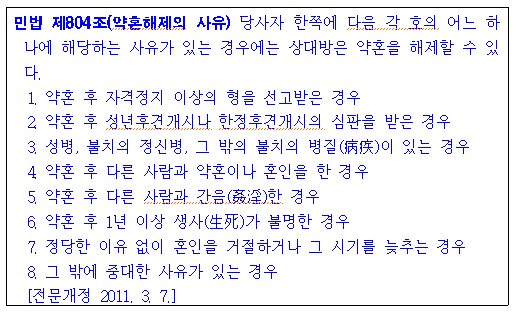 다만, 약혼을 해제할 수 있는 사유를 법에 규정하여 적법하게 약혼 관계를 깰 수 있게 해두었습니다.