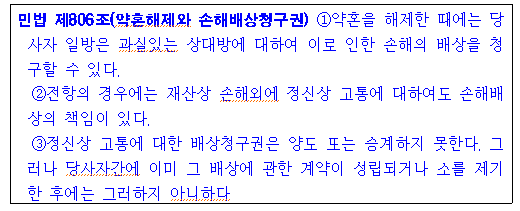 그 과정에서 상대방의 잘못으로 약혼이 파기된 경우 혼인 준비를 위해 쓴 돈에 대한 배상청구가 가능하며 정신적인 고통에 대해서도 배상청구가 가능합니다.