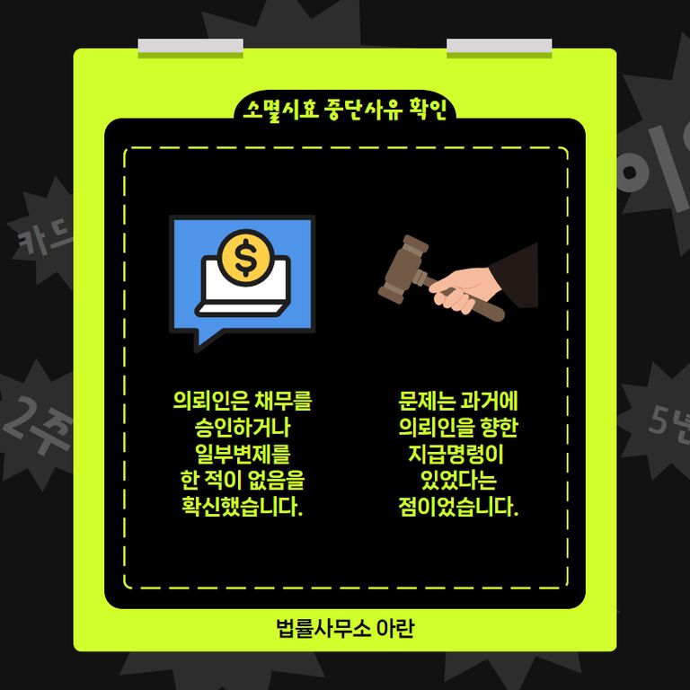 여기서 주의하실 점이 있습니다. 비록 소멸시효는 5년이지만, 어떤 이유에서든 소멸시효가 중단된 적이 있다면 그 중단 사유가 소멸된 때부터 다시 일정한 기간의 소멸시효가 진행된다는 점입니다.