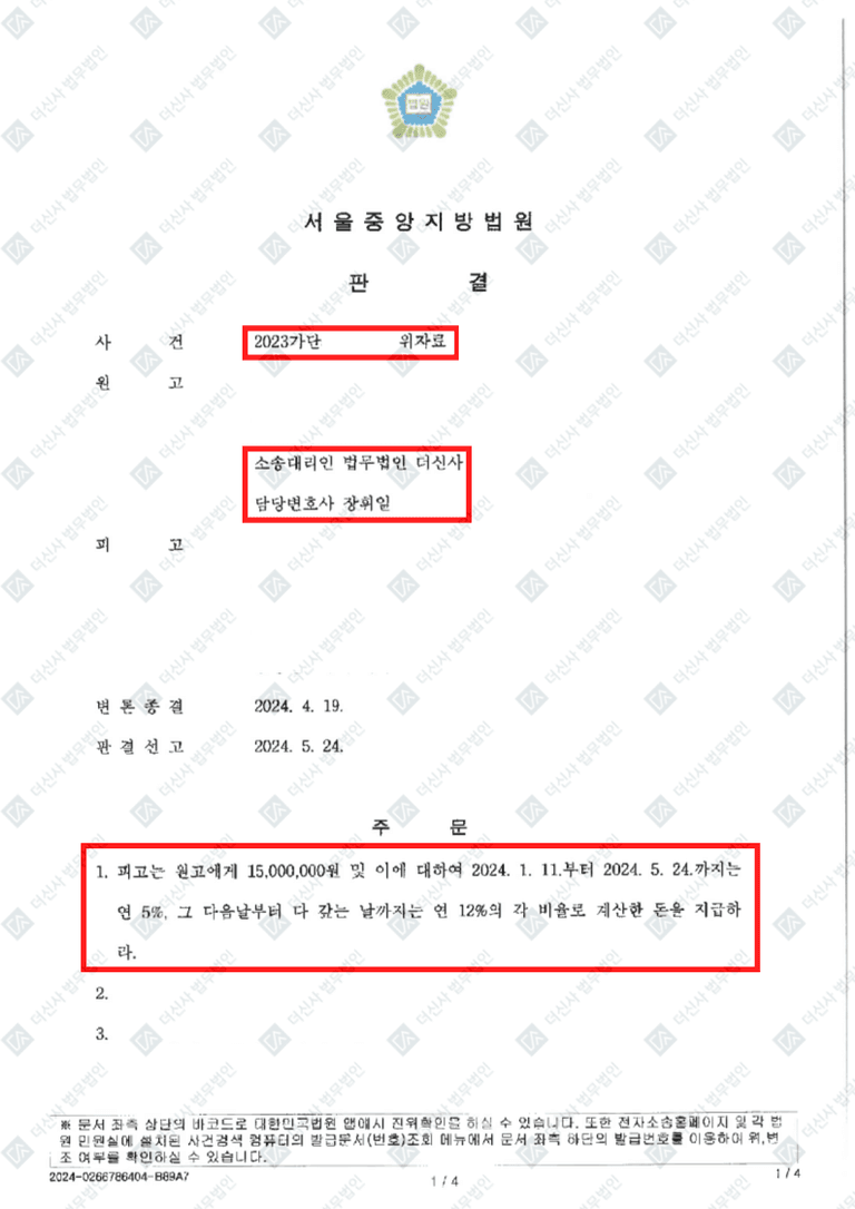 📌직장동료와 두 차례의 부정행위, 위자료 1,500만원 승소