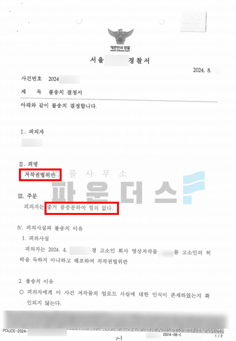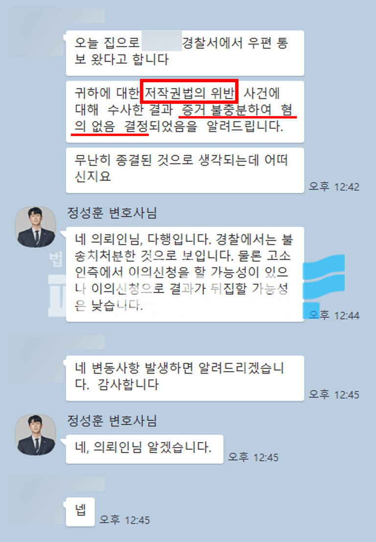 그 결과 의뢰인은 토렌트 불법 다운으로 인해 문제가 된 저작권법 위반 사건에서 불송치 결정으로 경찰 단계에서 마무리 지을 수 있었습니다.