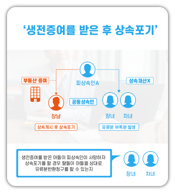 아들은 피상속인이 사망하자, 피상속인 명의로 남아 있는 상속재산이 없다는 것을 알고 법원에 상속포기를 하였고, 딸들은 피상속인 소유의 아파트가 아들에게 증여된 사실을 나중에 알게 되어 아들을 상대로 유류분반환청구소송을 제기하였고, 아들은 자신은 상속을 포기하였으므로 더 이상 아버지의 상속인이 아니다는 이유로 유류분을 반환할 의무가 없다고 주장한 사례입니다.