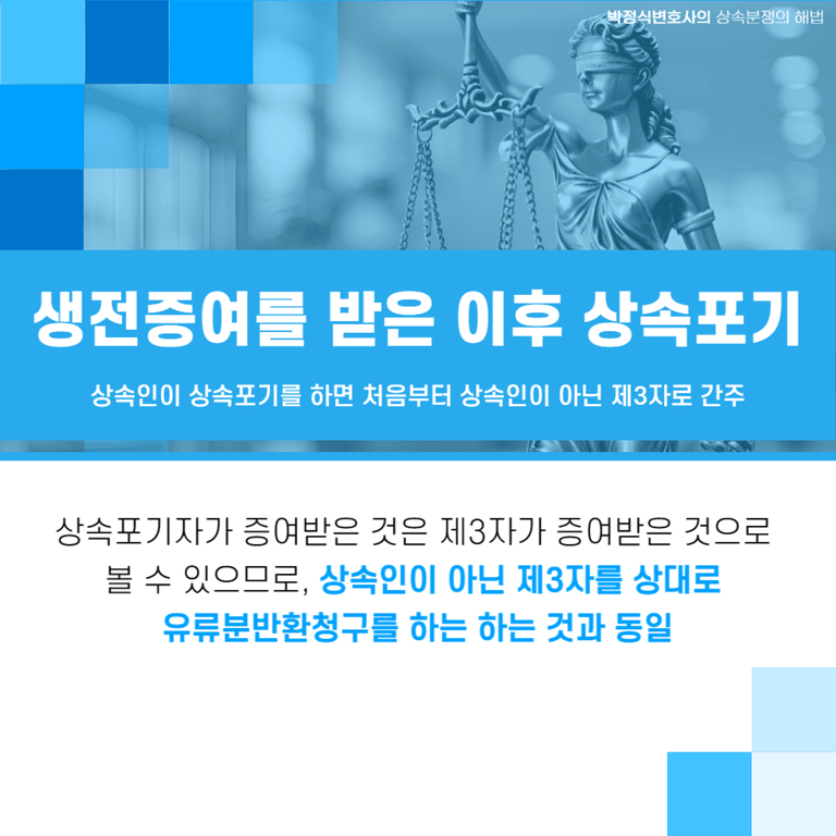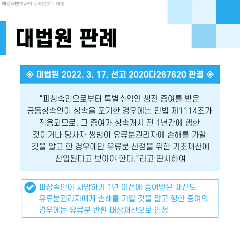 대법원에서도 “피상속인으로부터 특별수익인 생전 증여를 받은 공동상속인이 상속을 포기한 경우에는 민법 제1114조가 적용되므로, 그 증여가 상속개시 전 1년간에 행한 것이거나 당사자 쌍방이 유류분권리자에 손해를 가할 것을 알고 한 경우에 유류분 산정을 위한 기초재산에 산입된다고 보아야 한다.”라고 판시하여(대법원 2022. 3. 17. 선고 2020다267620 판결), 상속포기를 한 상속인이 피상속인이 사망하기 1년 이전에 증여받은 재산도 "유류분권리자에게 손해를 가할 것을 알고 행한 증여"의 경우에는 유류분 반환 대상재산으로 인정하고 있는 것입니다.