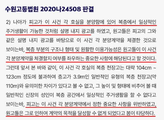 대부분 분양상담을 할때 이렇게 허위로 안내하거나 조감도나 평면도에 생활 가구들을 함께 그려놓아 수분양자들이 일반적인 2층집 구조라 생각하고 계약을 체결하게 되는데, 만일 분양계약 시 이렇게 설명받은 내용과 실물이 현저히 다른 경우에는 상대방에 의해서 기망이나 착오에 빠져 계약을 체결하게 된 것이기 때문에 이를 기초로 해서 민사소송을 제기하여 계약을 취소하고 계약금을 전액 반환받을 가능성이 높습니다. 실제로 지난 2022년에는 '최상층 복층 펜트하우스'라고 안내하며 복층 천장고가 1.8m에 이른다고 설명하고, 일상적인 주거생활이 가능한 것으로 광고한 수원의 한 오피스텔을 상대로 제기된 민사소송에서 분양계약 불이행을 이유로 수분양자들의 분양계약 해제를 인정한 판례가 선고된 바 있습니다. 이는 무분별한 허위·과장 광고에 일침을 가하고 수분양자들의 권리를 보호해준 판례라 할 수 있는데, 이렇게 분양대행사나 시행사의 허위·과장 광고를 토대로 분양계약을 취소하기 위해서는 반드시 이를 입증할 수 있는 객관적인 증거자료들이 뒷받침 되어야 하므로, 계약 당시 받은 광고 및 홍보자료, 관련 직원과의 대화내용(문자메시지, 카카오톡, 대화녹음 등)과 계약서와 같은 사항들을 반드시 잘 모아두어야 합니다.