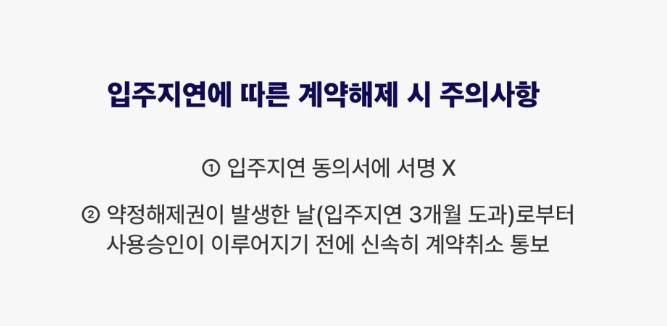 두번째로는 행정청의 사용승인 전에 반드시 계약해제 의사표시를 전달해야 합니다. 사용승인이 이루어지면 시행사에서는 자신의 의무를 이행한 것이기 때문에, 이후에는 더 이상 계약해제를 주장할 수 없습니다. 따라서 추이를 지켜보시다가 입주지연이 3개월이 초과된 시점에 곧바로 신속하게 계약해제를 통보하는 것이 가장 안전합니다. 특히 요즘에는 분양경기가 좋지 않기 때문에, 대부분의 경우 계약해지를 통보하고 나서 다시 생각이 바뀌어 계약을 유지하고 싶다고 말하면 대부분의 시행사에서 계약을 그대로 유지할 가능성이 매우 높습니다. 따라서 만일 아직 계약을 유지할지 말지 고민이 되신다면 일단 계약해제에 대한 내용증명을 먼저 보내두어 고민할 수 있는 약간의 시간을 좀 더 버는 것도 방법일 수 있습니다.