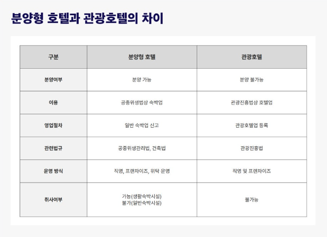 분양형 호텔(수익형 호텔)은 공중위생관리법의 적용을 받는 숙박업으로 일반인들이 아파트처럼 호텔 내 객실을 분양하여 소유하거나, 각 호실의 지분을 나누는 방식으로 운영되는 호텔입니다. 취사가 가능하면 생활형숙박시설(생숙) 혹은 레지던스라고 불리우며, 취사가 불가한 경우 일반숙박시설로 나뉘게 됩니다. 최근에는 분양형 호텔이 예전에 비해 줄어든 편이지만 2010년 즈음 부터 외국인 관광객이 많아지자 정부에서 2012년에 '관광숙박산업 활성화 방안'을 발표하였고, 각종 정책지원에 힘입어 분양형 호텔 및 레지던스 사업이 생기게 되었습니다. 이에 숙박업에 경험이 없더라도 위탁운영사를 통해 관리할 수 있는데다 개별등기 및 전매가 가능하다는 장점으로 인해 재테크를 위한 수익형 부동산 중의 하나로 꼽히고 있습니다.