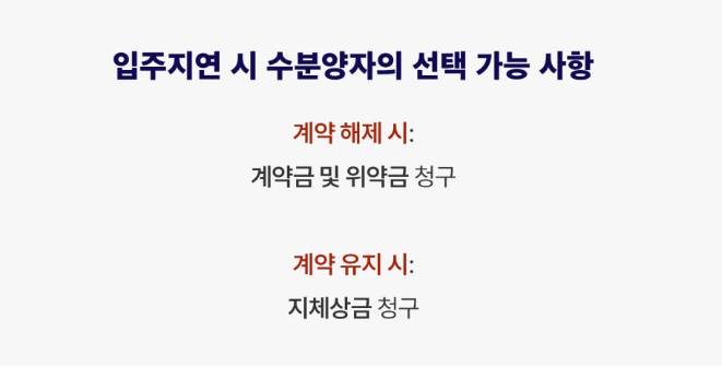 통상적으로 표준 분양계약서에는 입주예정일이 기재되어 있고, '매도인의 귀책사유로 인해 매수인의 입주가 예정일보다 3개월을 초과할 시 분양 계약을 해제할 수 있다'라는 조항이 명시되어 있습니다. 따라서 입주예정일이 3개월 이상 지연될 것이 명확한 경우, 수분양자들은 3개월이 지난 직후부터 해제권을 행사하여 계약을 해제하고 계약금 및 위약금을 청구할 수 있습니다. 또한 계약을 유지하고자 하더라도 지체상금을 청구할 수 있는데, 위약금은 통상적으로 총공급금액의 10%입니다. 그런데 만일 두가지 경우에 대하여 내용증명을 보냈을 때, 시행사에서 거부를 하거나 비협조적으로 나올 경우 민사소송을 제기할 수 있으며, 채권의 보전을 위해 가압류 등의 절차를 진행하는 것이 좋습니다.