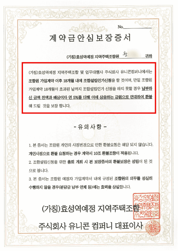 효성역예정 지역주택조합은 조합계약 체결 당시 계약을 유도하기 위하여 '조합가입계약 이후 18개월이 초과된 날까지 조합설립인가 신청을 하지 못할 경우, 납부하신 금액 전액과 배상이자 5%를 더해 이에 상응하는 금원으로 연대하여 환불해 드릴 것을 보장합니다'라고 기재된 계약금 안심보장증서를 교부하였습니다. 이는 수많은 재판에서 이미 무효증서로 일관되게 판결된 사항으로, 사기성이 매우 짙은 문서입니다. 지역주택조합에서 교부하는 대부분의 안심보장증서는 조합총회의 결의를 통해 결정된 후 작성되어야 함에도 불구하고 적법한 절차를 거치지 않은 채 발급한 후 이를 활용하여 계약 가입을 유도하기 때문에, 법원에서는 별다른 쟁점이 없는 한 조합측의 기망성을 인정하여 계약 취소 및 납입금 전액 반환을 판결합니다.