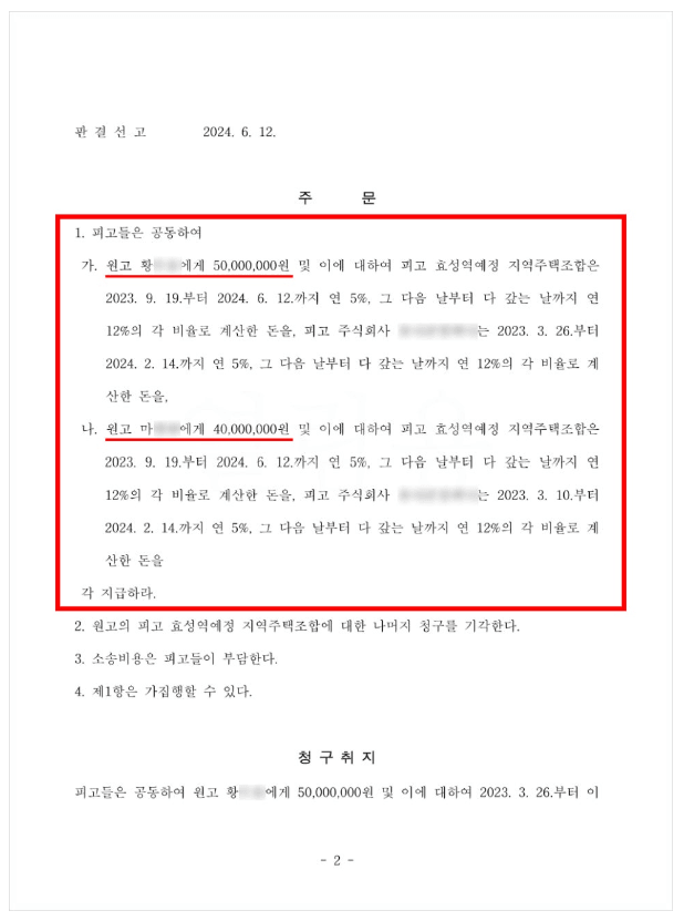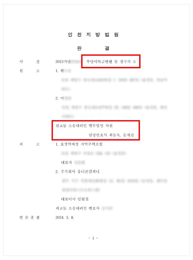 효성역예정 지역주택조합은 인천광역시 계양구 효성동 579번지 일대에서 아파트 건설을 추진 중인 지역주택조합 입니다. '서해그랑블뉴어반' 아파트라는 명칭으로 효성역 근처의 입지환경과 인프라를 내세우면서 2022년에 모합원 모집신고를 하였지만, 사업이 원활하게 추진될 것이라고 안내하였던 것과는 달리 예정대로 진행되지 않자, 조합원이셨던 저희 의뢰인(황00, 마00)께서는 법무법인 차원의 최동욱 변호사에게 조합 가입 계약을 취소하고 납입금을 반환받고자 조합측을 상대로 한 민사소송을 의뢰하셨습니다.