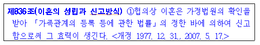 제836조(이혼의 성립과 신고방식) ①협의상 이혼은 가정법원의 확인을 받아 「가족관계의 등록 등에 관한 법률」의 정한 바에 의하여 신고함으로써 그 효력이 생긴다. <개정 1977. 12. 31., 2007. 5. 17.>
