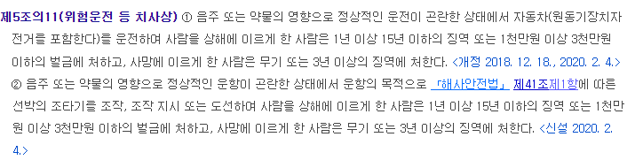 '특정범죄 가중처벌 등에 관한 법률'은 음주 또는 약물의 영향으로 정상적인 운전이 곤란한 상태에서 자동차를 운전하여 사람을 상해에 이르게 한 경우 1년 이상 15년 이하의 징역 또는 1,000만 원 이상 3,000만 원 이하의 벌금에 처하고, 사망에 이르게 한 경우에는 무기 또는 3년 이상의 징역에 처하도록 규정하고 있습니다.