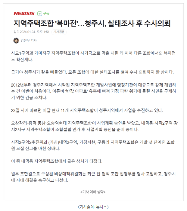 전국적으로 지역주택조합으로 인해 토지 미확보 및 토지확보율 허지 고지, 사업 지연, 분담금 횡령 등의 문제로 잡음이 이어지고 있습니다. 이러한 가운데 충북 청주에서도 사모1구역 지역주택조합, 가마지구 지역주택조합, 내덕동 지역주택조합, 사직2구역 지역주택조합, 오송역 지역주택조합 등 여러 지역주택조합 및 지역주택조합 추진위가 문제점을 드러내 고소와 소송이 난무해지자 청주시에서는 올해 처음으로 지역주택조합에 대한 실태조사를 벌이는 등 단속을 강화하고 있습니다.