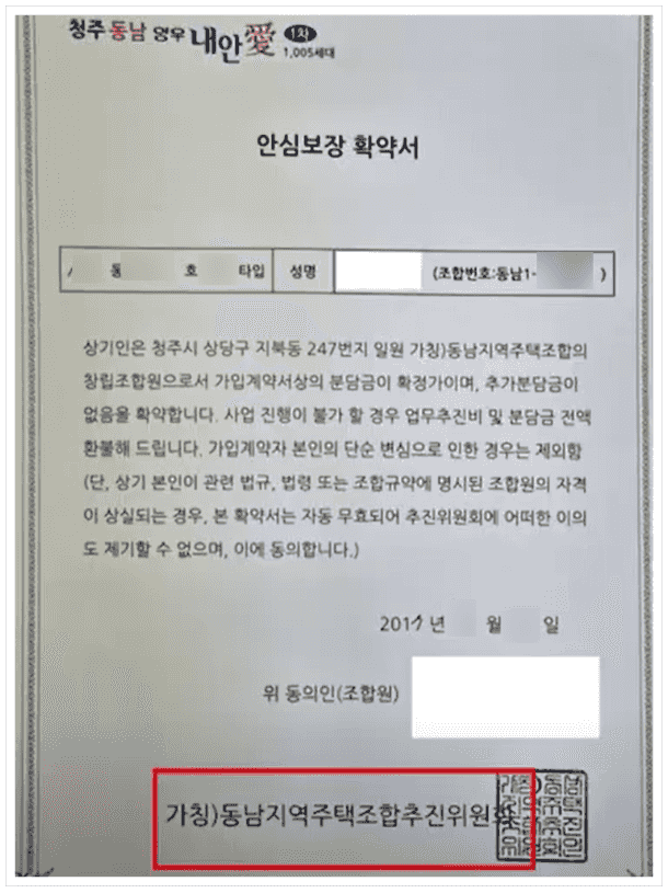 동남 지역주택조합은 청주시 상당구 일대에서 아파트를 건립하고자 만들어진 조합으로 의뢰인께서는 2017년에 조합 가입 계약을 체결하셨습니다. 당시 분양상담사는 의뢰인에게 "계약을 체결하면 '사업 진행이 불가 할 경우 업무추진비 및 분담금 전액을 환불해 드립니다'라는 내용과 '추가 분담금이 없음을 확약합니다'라는 내용이 기재된 안심보장 확약서를 교부할 예정이니 안심하고 계약을 체결해도 좋다"라고 안내하면 가입계약을 유도하였습니다. 이에 의뢰인은 사업 진행이 잘 안되어도 투자원금을 보전할 수 있을 것이라고 생각하여 안심하고 계약을 체결하였는데, 지역주택조합의 재산은 총유물에 해당하기 때문에 조합이 이러한 환불 보장을 약속하기 위해서는 사전에 반드시 조합 총회 결의를 반드시 받아야 합니다. 즉, 만일 조합이 조합 총회 결의를 받지 않은채 이러한 확약서를 교부하였다면 해당 문서는 무효인 것이고, 이에 따라 계약 또한 무효에 불과하다는 것이 다수의 법원에서 내려진 일관된 판결입니다.