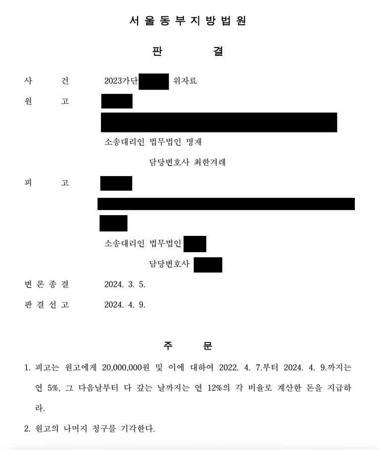 아내들의 상간소송에서는 불륜이 인정되어 원고 아내는 피고의 처에게 위자료 2천만 원을 지급하라는 판결이 확정됩니다.