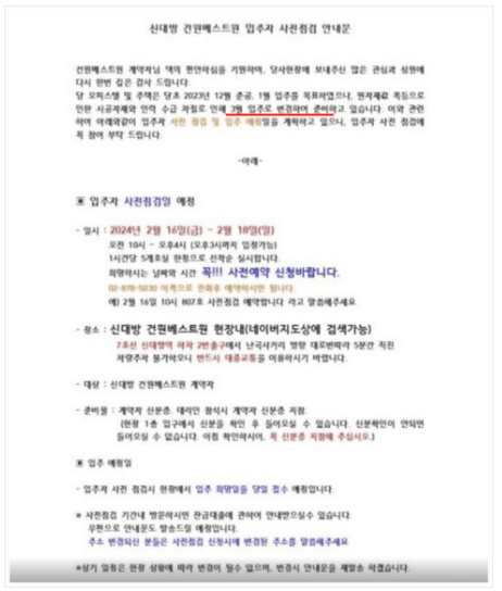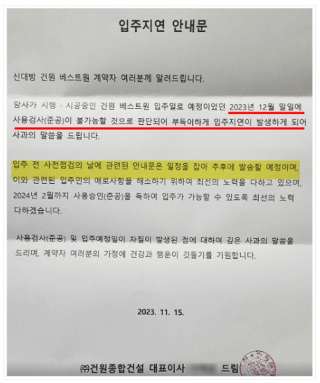 일례로 서울 관악구에 소재한 신대방 건원베스트원 오피스텔의 경우 수분양자들의 계약서 상으로 입주 예정이 지난해 12월이었으나, 아래와 같이 지난해 11월을 시작으로 여러차례 입주가 지연되었는데, 수분양자들께서는 입주지연이 발생하게 된 정확한 원인도 모르는 채 입주가 7개월째 지연되자 피해를 호소하시면서 법무법인 차원의 최동욱 변호사에게 상담문의를 주고 계십니다.