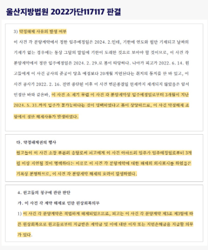 특히 입주지연에 따른 수분양자의 약정해제권은 시행사가 행정청의 사용승인을 받으면 그 이후에는 약정해제권이 소멸되기 때문에 더 이상 계약해제를 주장할 수 없습니다. 따라서 사용승인이 이루어지기 전에 신속하게 계약해제 통보를 진행하셔서 추가적인 금전손해를 방지하실 것을 권장드립니다. 사용승인이 이루어졌더라도 그 전에 계약해제를 통보한 상태라면 동일하게 약정해제권이 인정되기 때문에 계약해제를 고려 중이시라면 신속하게 해제 통보를 진행하실 것을 조언 드립니다. 이때, 계약 해제를 통보하는 것에 대한 문자메시지, 통화 녹취록 또는 내용증명서 등의 증거를 남겨두는 것이 반드시 필요하며, 분양계약 해제 관련 사안들은 납입금 반환과 위약금 등의 문제가 얽혀 있어 대부분 사안이 복잡하고 민감하기 때문에 반드시 유사 사례에 경험과 노하우가 풍부한 변호사의 조력을 받으신 후 신속하게 대응책을 진행하시길 권유 드립니다.